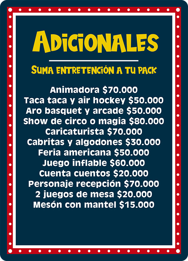 Si ninguno de nuestros planes se ajusta a lo que buscas, te invitamos a visitar nuestra sección “Arma Tu Pack”, donde podrás crear una celebración totalmente personalizada, seleccionando los servicios que mejor se adapten a tus necesidades, presupuesto y estilo de evento. Tu fiesta, a tu manera.