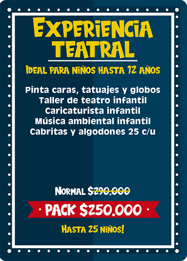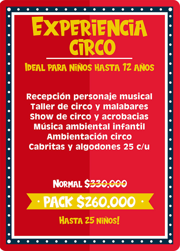 Una verdadera experiencia de circo: recepción con personaje musical, taller de malabares, ambientación temática y un espectacular show de circo y acrobacias, donde los niños no solo disfrutan, sino que se convierten en protagonistas, junto a cabritas, algodones y música para una celebración mágica e inolvidable.