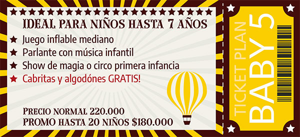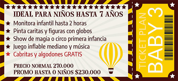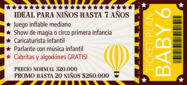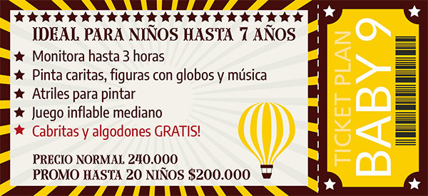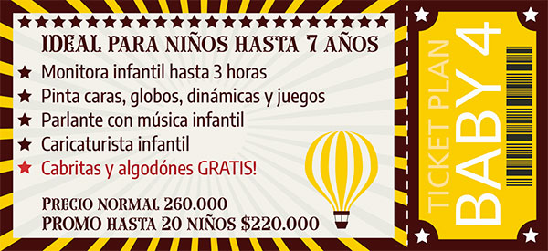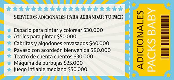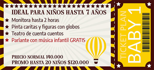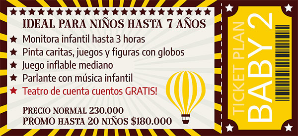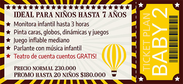 Pack Baby 1: Ideal para niños hasta 7 años. Este plan incluye la participación de una monitora hasta 2 horas. Quien primero hará lindos pinta caritas a elección, luego el relato de lindos y entretenidos cuenta cuentos en el teatro “kamishibai”, para finalizar con la entrega de figuras con globos para todos los niños. Incluimos ademas música ambiental infantil sin costo.