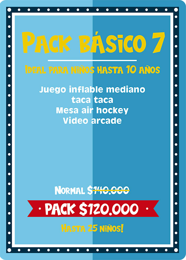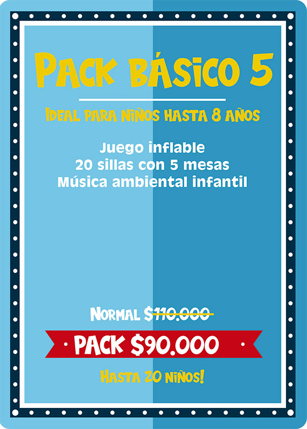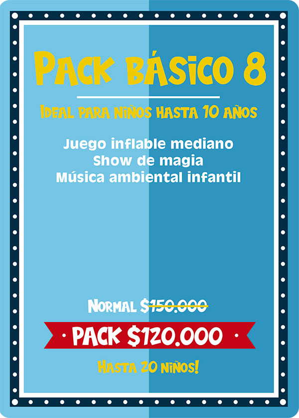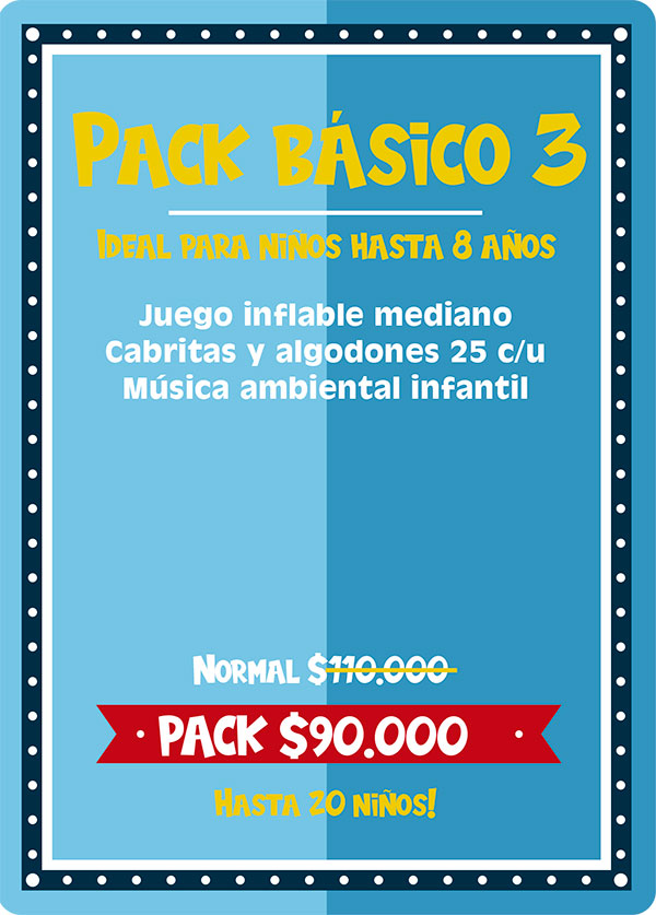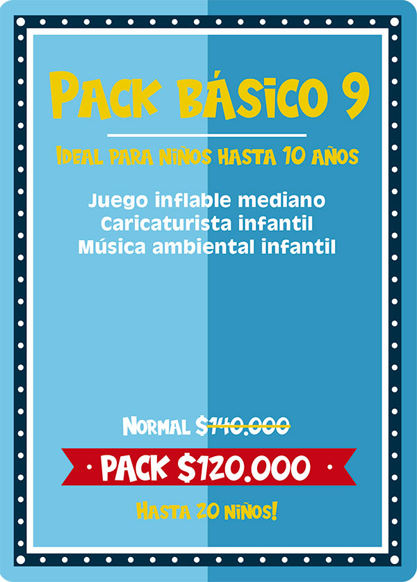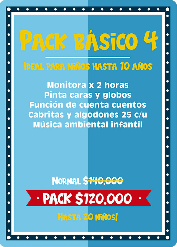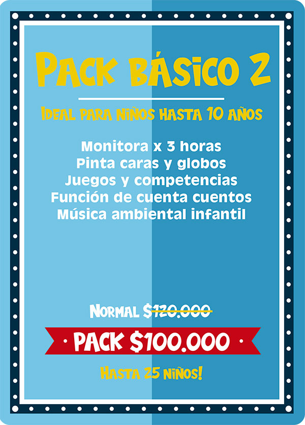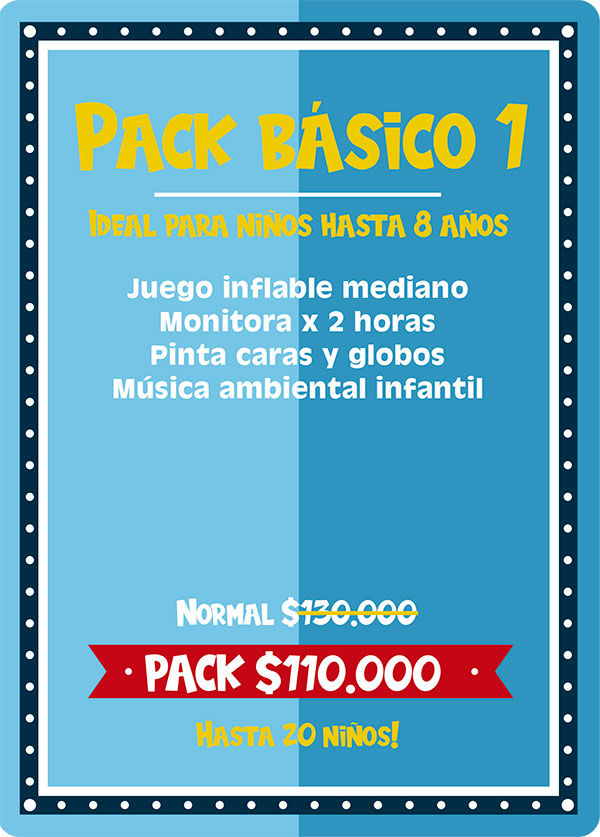Pack basico 1: Ideal para niños hasta 8 años. Este plan incluye una monitora infantil por dos horas quien recibirá a los niños con lindos “pinta caritas” y figuras con globos. Pack incluye ademas música ambiental y la instalación de un entretenido juego inflable.