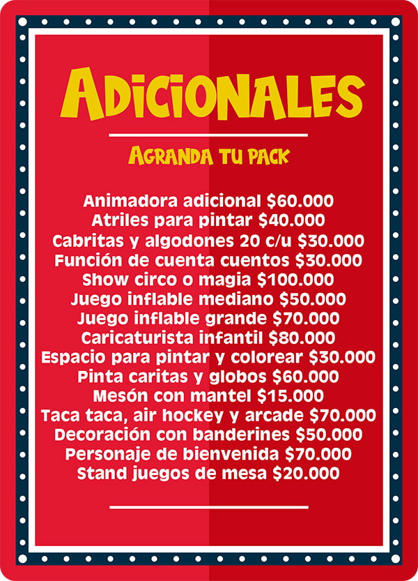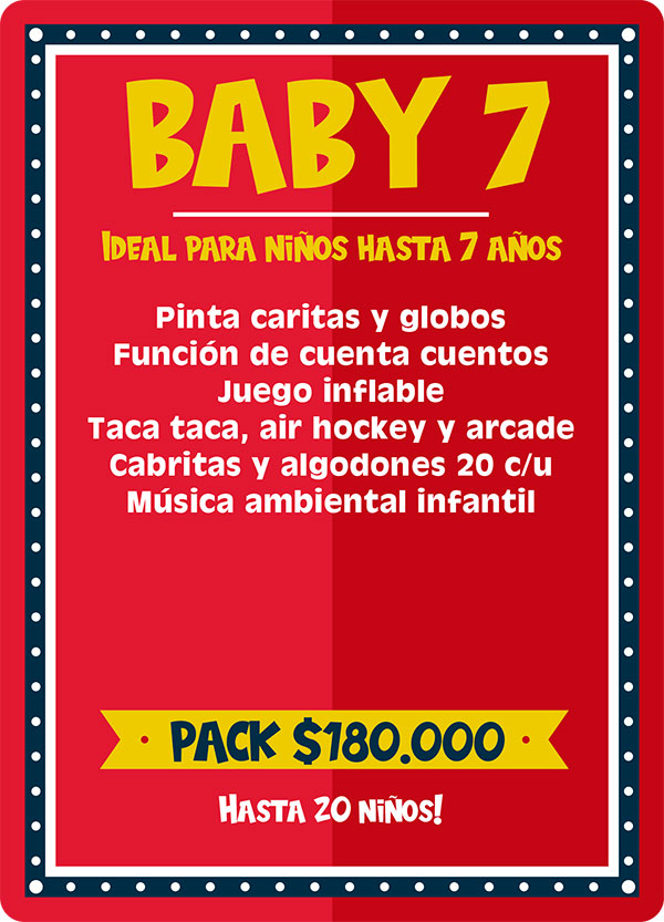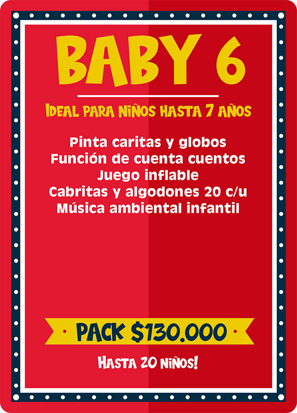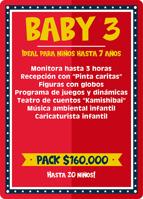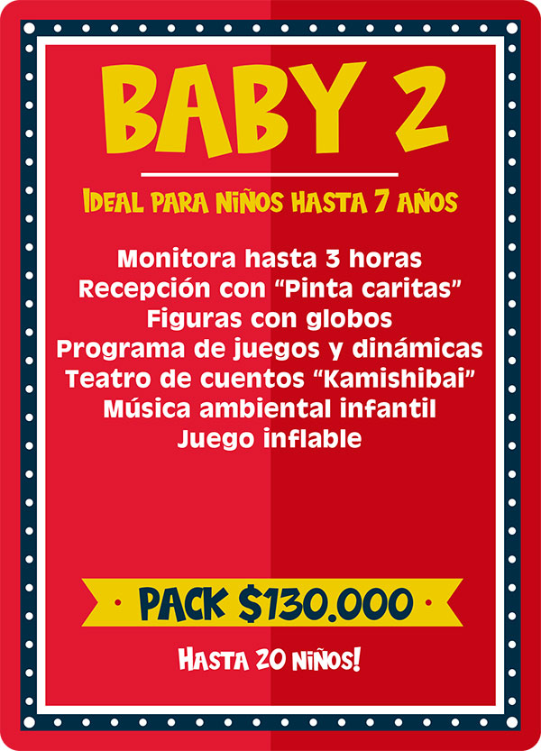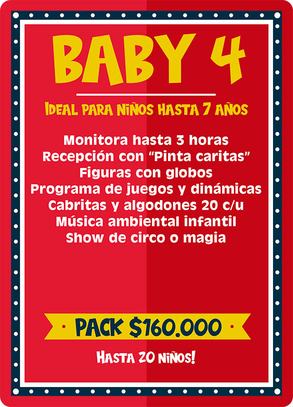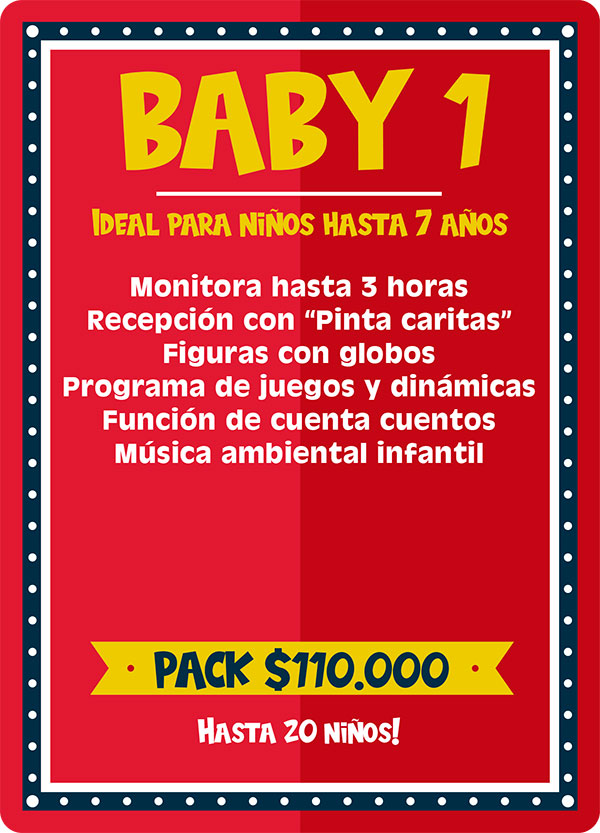 Pack Baby 1: Ideal para niños hasta 7 años. Este plan incluye la participación de una animadora infantil hasta 3 horas quien realizara lindos pinta caritas, juegos con los niños y los padres, el relato de mágicos cuenta cuentos, el canto del cumpleaños, la apertura de la piñata y para finalizar la entrega de lindas figuras con globos para todos los niños. Incluimos ademas música ambiental infantil. Ve el cuadro “adicionales” para agrandar este pack.