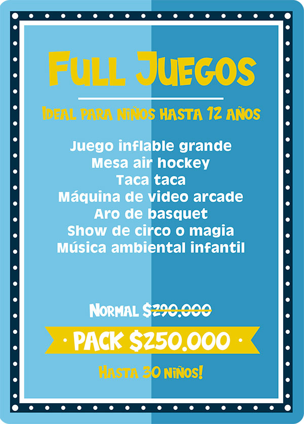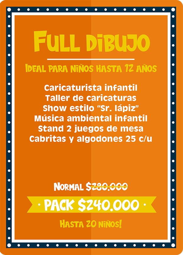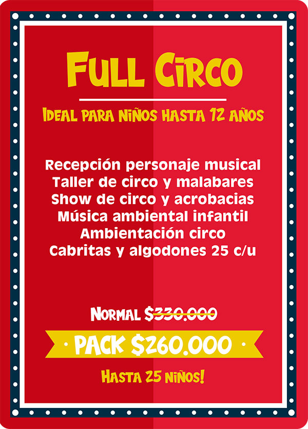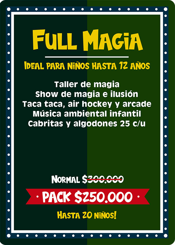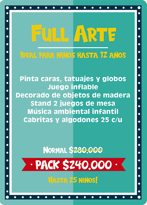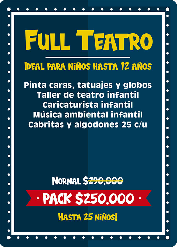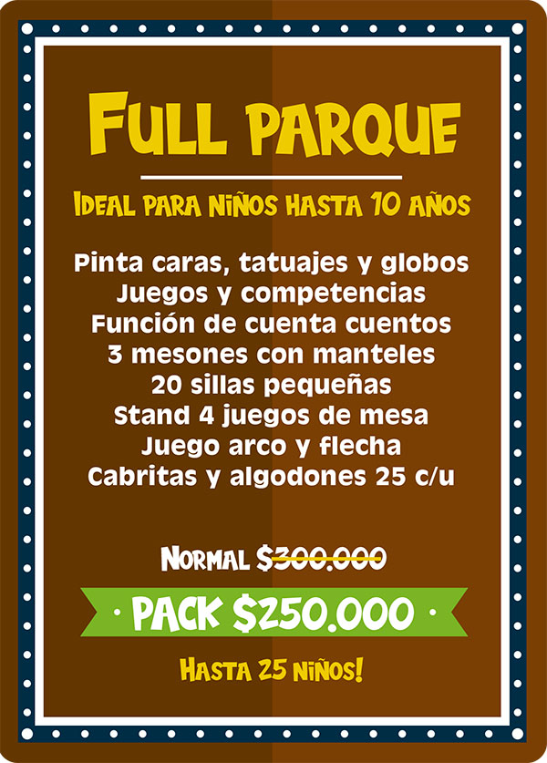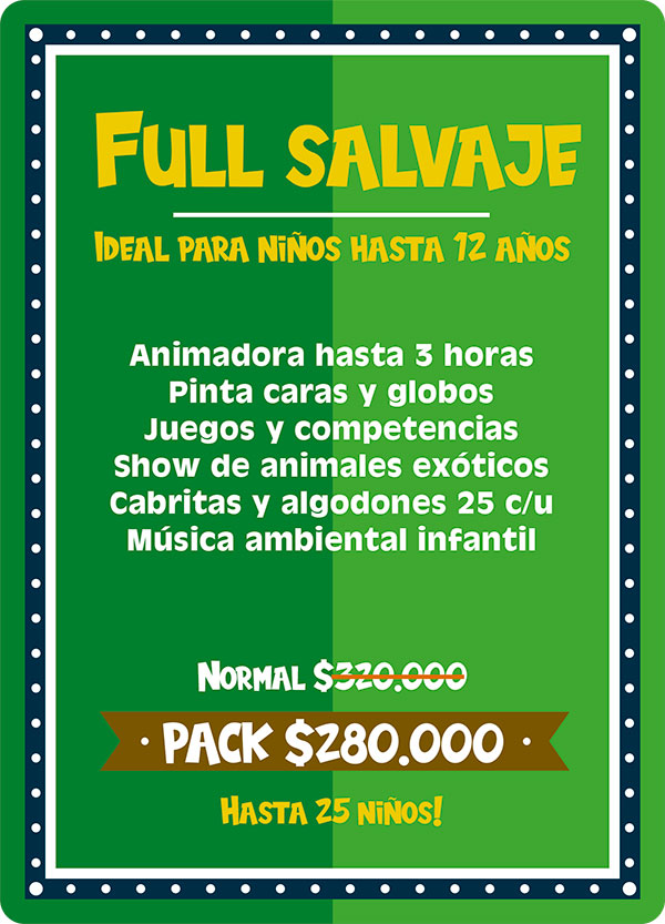 Pack full salvaje: Ideal para niños hasta 12 años. Este plan es para los niños amantes de los animales, pues incluye un sorprendente show de animales exóticos, donde mediante una entretenida dinámica los niños conocerán 10 especies distintas entre los cuales están; la Pitón Real, Dragón Barbudo, Esquinco de lengua azul, Tortuga de tierra, Chinchilla, Hurón, Conejo enano, Erizo, araña Pollito y cucaracha de Madagascar. Este pack incluye ademas una animadora quien recibirá a los niños con lindos “pinta caritas”, realizara juegos y competencias y entregara figuras con globos a todos los niños. Incluimos también la entrega de un paquete con 25 cabritas y 25 algodones de azúcar envasados.
