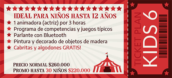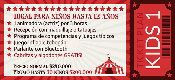 Pack kids 1: Ideal para niños hasta 12 años. Este plan incluye un entretenido programa de animación hasta 3 horas. Primero iniciamos con una recepción con música, pinta caritas o tatuajes de manera opcional por 30 minutos, luego partimos con un programa intenso de juegos, dinámicas y competencias estilo “gincanas”, donde por equipos los niños participan finalmente por un gran premio grupal o general. Incluimos también la instalación de in inflable tamaño grande y un parlante Bluetooth con música ambiental entretenida. Al tomar este plan GRATIS cabritas y algodones envasados.